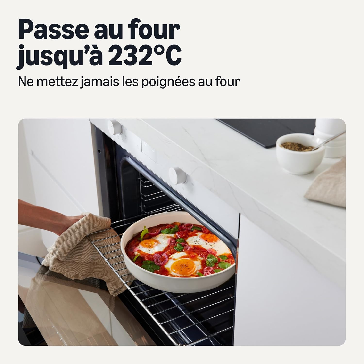 Les poignées amovibles sécurisées permettent un gain de place considérable, un nettoyage simple et un passage rapide du feu au four.*